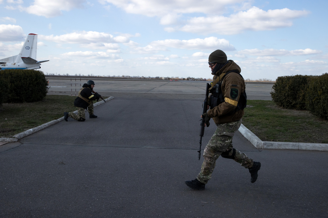 <p>Ukrainian volunteer fighters at the civilian airport in Mykolaiv on Thursday, March 10, 2022. The port city of Mykolaiv is being shelled by Russian forces every day. Bodies are piled at the morgue. But residents refuse to succumb. (Tyler Hicks/The New York Times)</p>