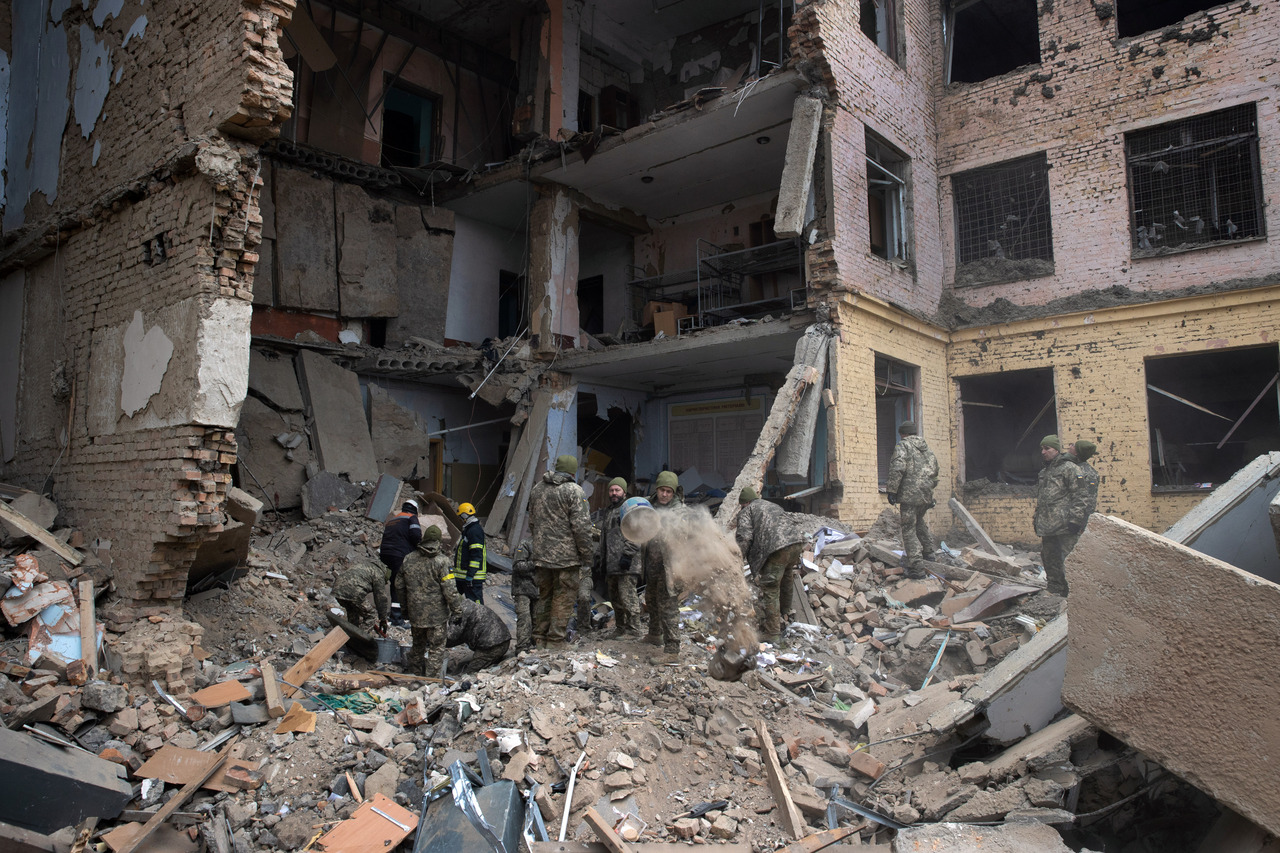 Ukrainian military personnel at a barracks which was attacked by Russian forces in Mykolaiv on March 8, 2022.