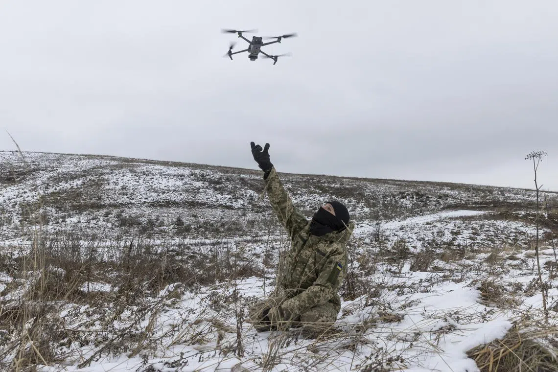 A member of a volunteer battalion practices the launch and retrieval of a DJI Mavic drone, as the group trains outside Kyiv, in December 2022.