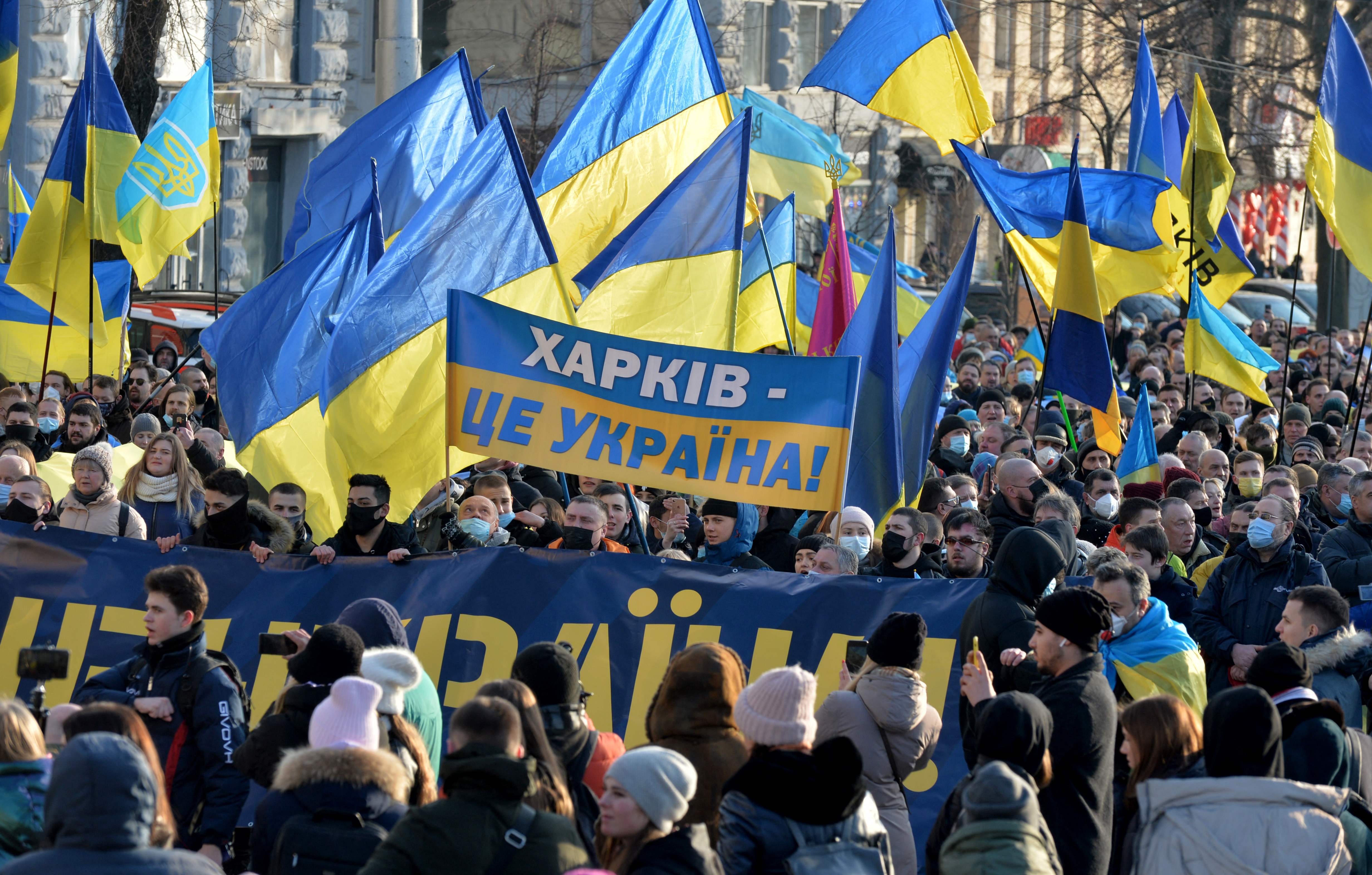 Protesters carry a banner reading "Kharkiv is Ukraine", during the march on Feb 5, 2022.