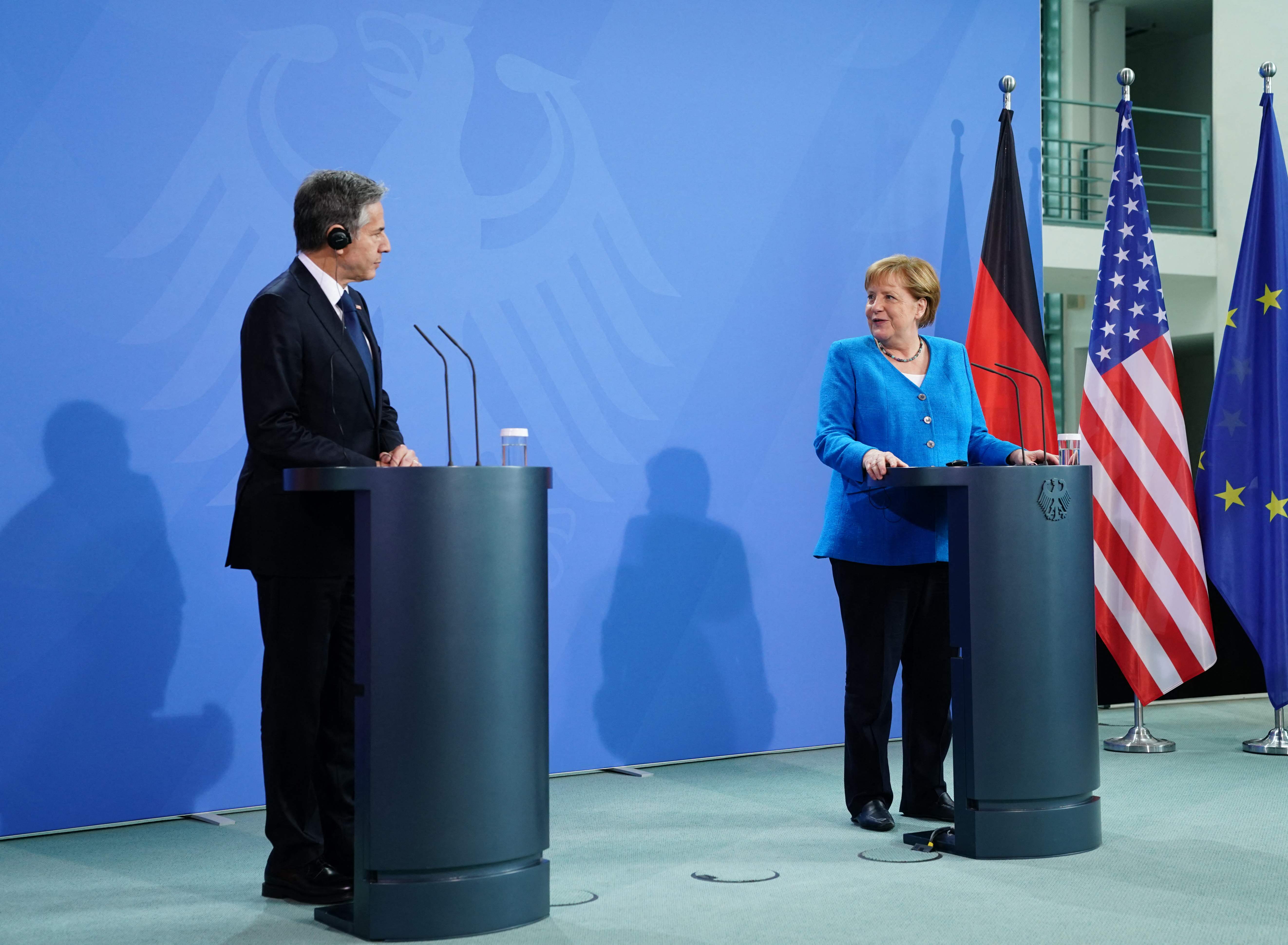 German Chancellor Angela Merkel (right) and US Secretary of State Antony Blinken give a joint press conference at the Chancellery in Berlin, on June 23, 2021.