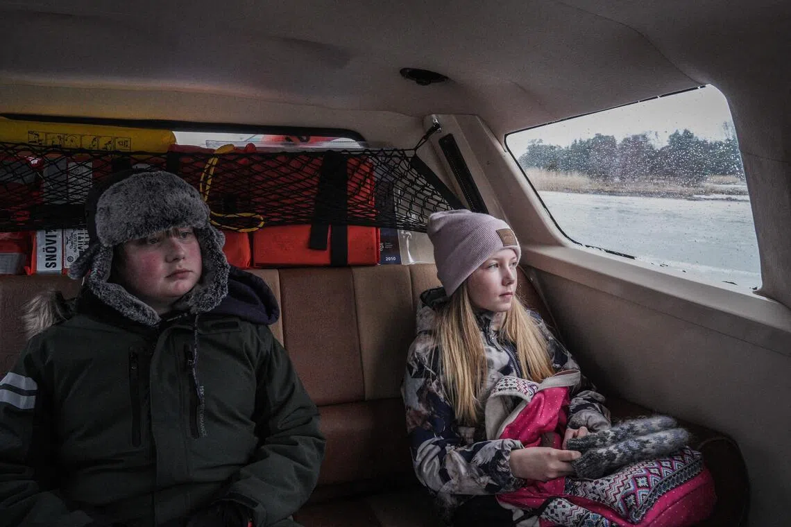 Pupils Hugo Wickstrom and Julia Jalkanen sit inside an hovercraft on their way home from school on March 3, 2026, in Pargas, Finland.