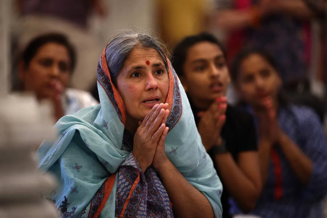 Women praying during a vigil at the International Siddhashram Shakti Centre in London, in memory of those who lost their lives in the Air India crash.