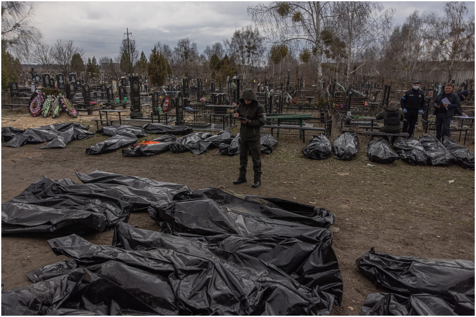 Police officers and forensic personnel identifying the bodies of those who were killed in Bucha, Ukraine, on April 6, 2022.