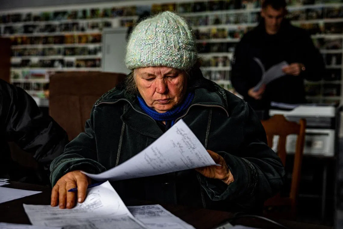 Mrs Anna Sukhova, 78, fills out paperwork in Izyum to submit her DNA for the identification of her brother.