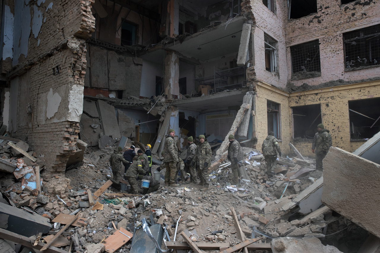 Military personnel at a barracks used by Ukrainian airborne troops that was attacked by Russian forces the day before in Mykolaiv, Ukraine, on March 8, 2022.