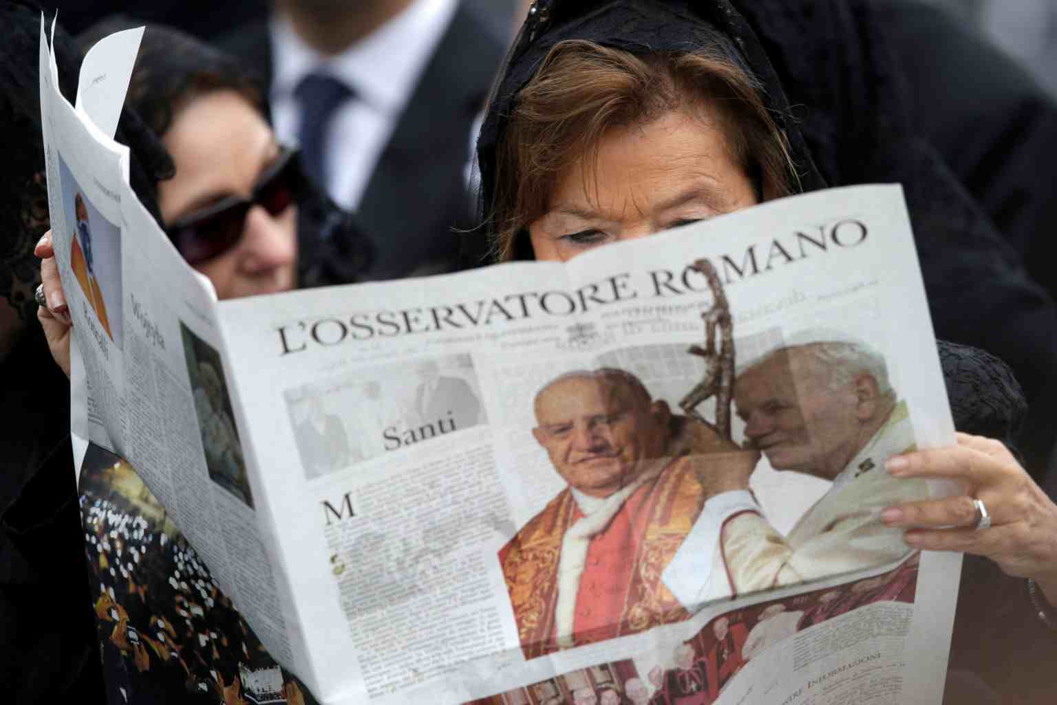 In a file photo taken on April 27, 2014, a woman reads a copy of the Vatican newspaper L'Osservatore Romano as she waits for the canonisation ceremony in St Peter's Square at the Vatican.