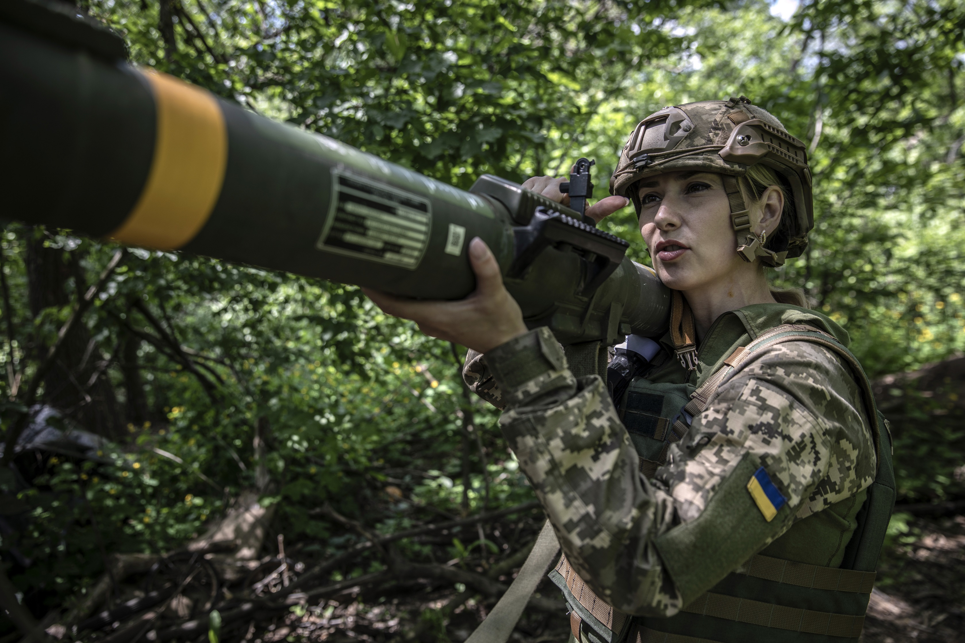 A Ukrainian soldier hoists an AT4 anti-tank weapon at a defensive position only a few hundred yards from Russian troops, near the city of Donetsk in eastern Ukraine.
