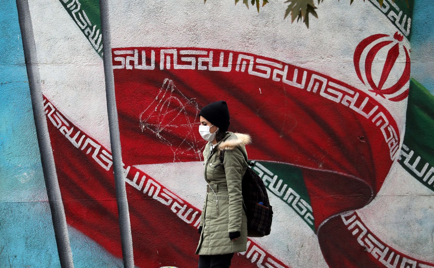 An Iranian girl walks past a mural featuring Iran's national flag in a street in Teheran, Dec 3, 2020.