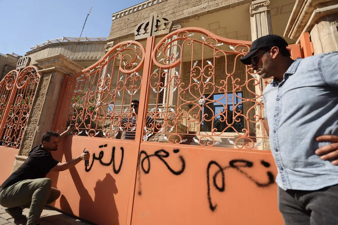 A man sprays graffiti at the entrance to the Swedish embassy in Baghdad.