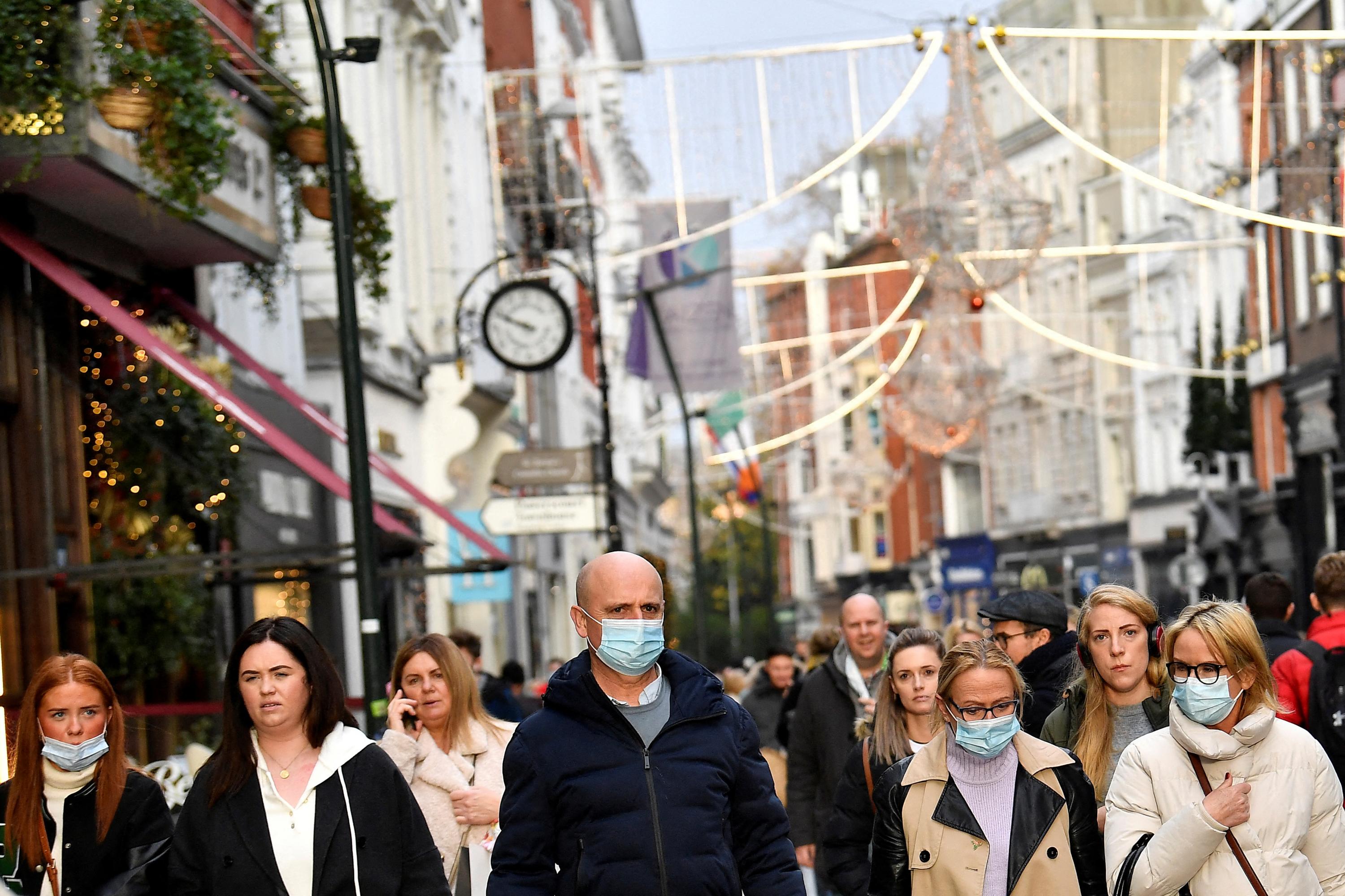 People wear protective face masks while out for Christmas shopping, amid the spread of the coronavirus pandemic, in Dublin, Ireland, on Dec 17, 2021.
