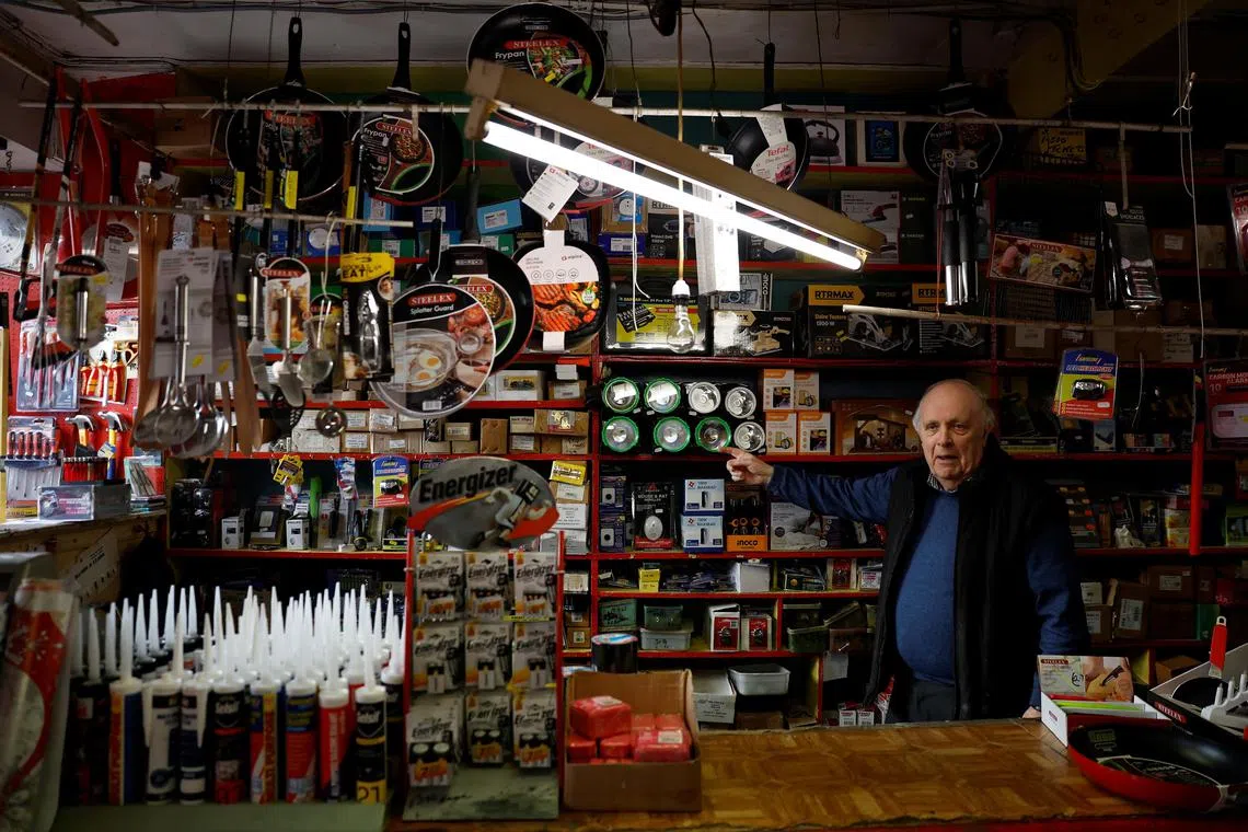 Shopkeeper Michael Mulligan, 65, standing behind the counter of his hardware shop.