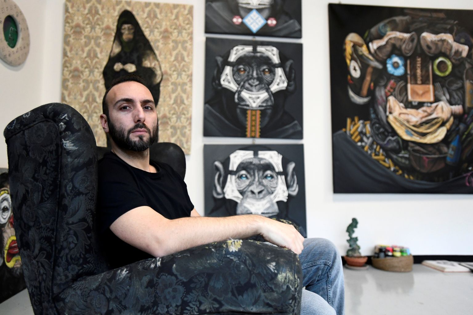 Italian artist Simone Fugazzotto, who designed an anti-racism artwork featuring three side-by-side paintings of apes that was presented by Italian soccer league Serie A, poses for a photograph in Milan, Italy.