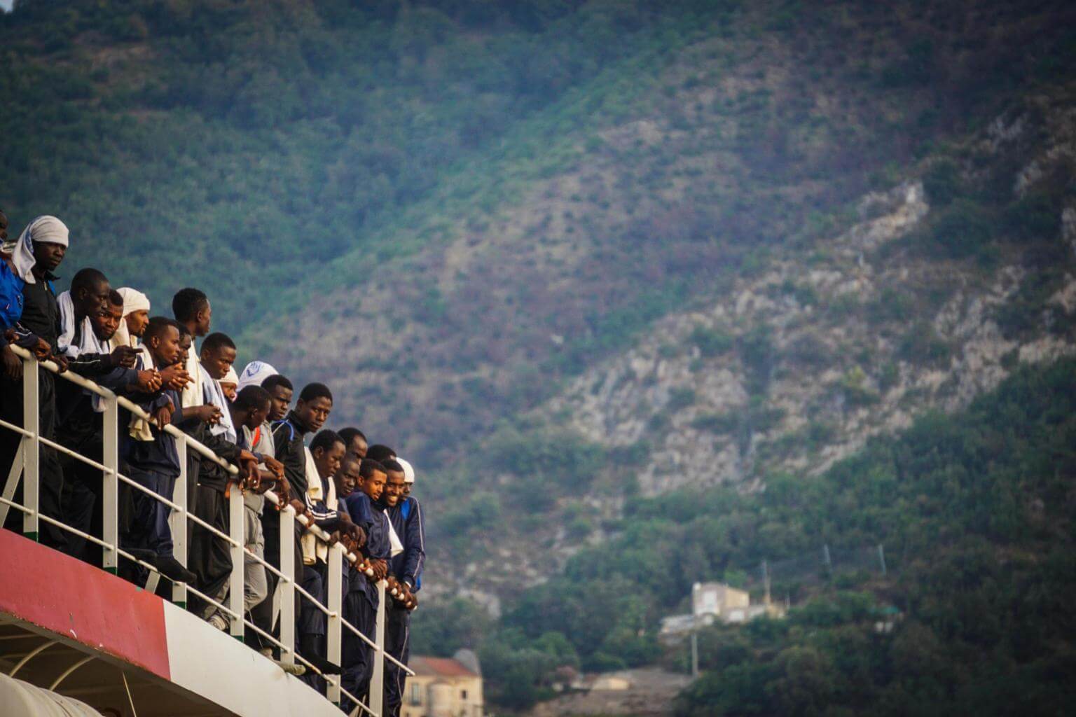 Migrants aboard the humanitarian 'Vos Prudence' ship of Doctors Without Borders (Medecins Sans Frontieres, MSF) arrive at Molo Manfredi quay, in Salerno's main harbour, Campania Region, southern Italy,on July 14, 2017.