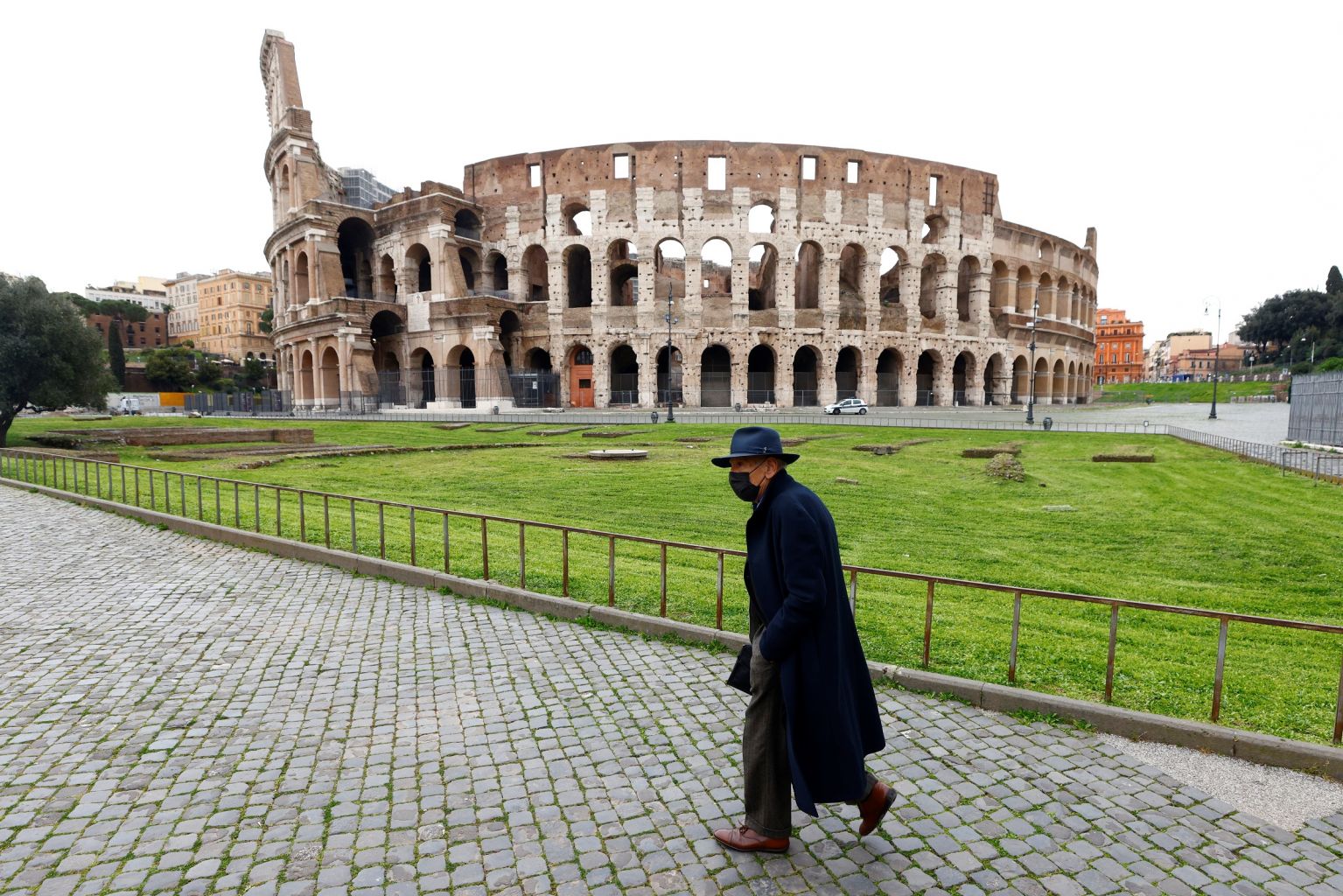 A man walks near the Colosseum on the second day of lockdown in Rome, Italy, March 16, 2021.