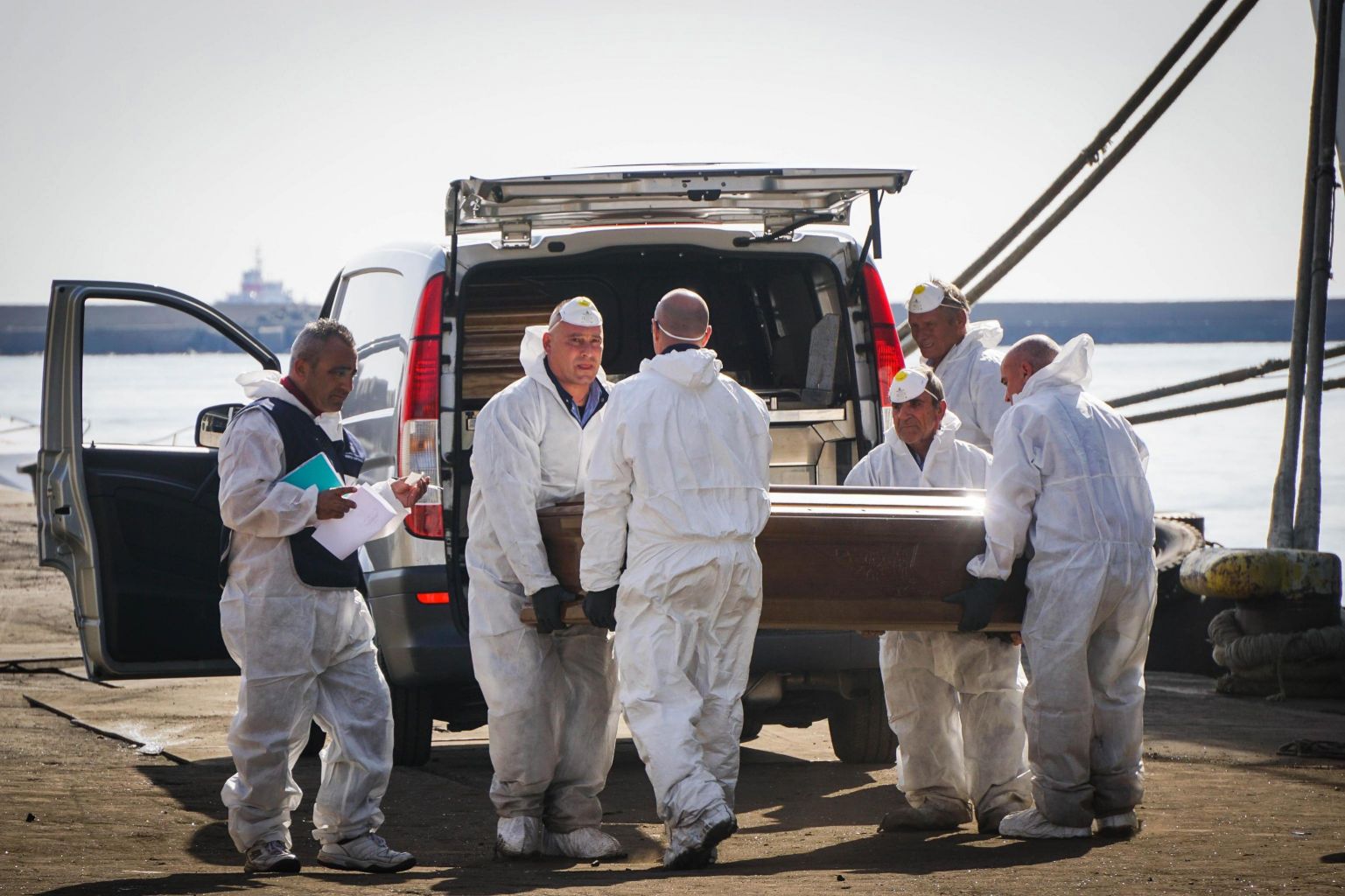 Rescue workers carrying a coffin containing the body of a migrant taken from the Spanish ship Cantabria in the harbour of Salerno, Italy, on Nov 5, 2017.