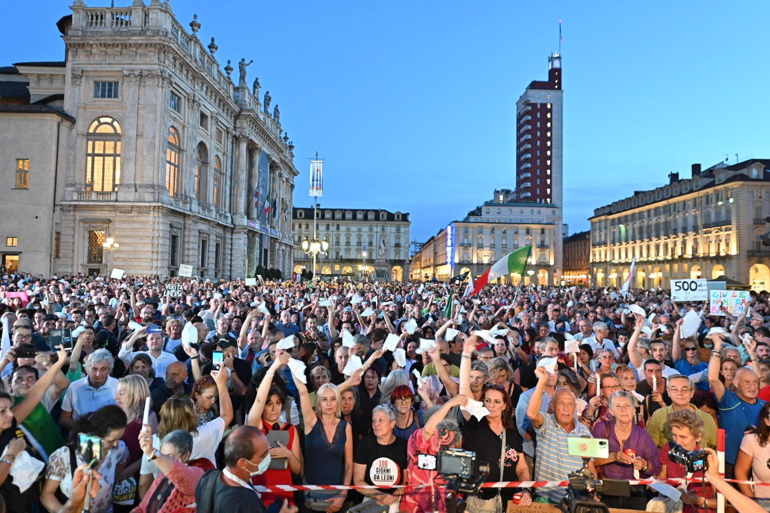 People demonstrate against the Green Pass, in Turin, Italy, on Aug 5, 2021.