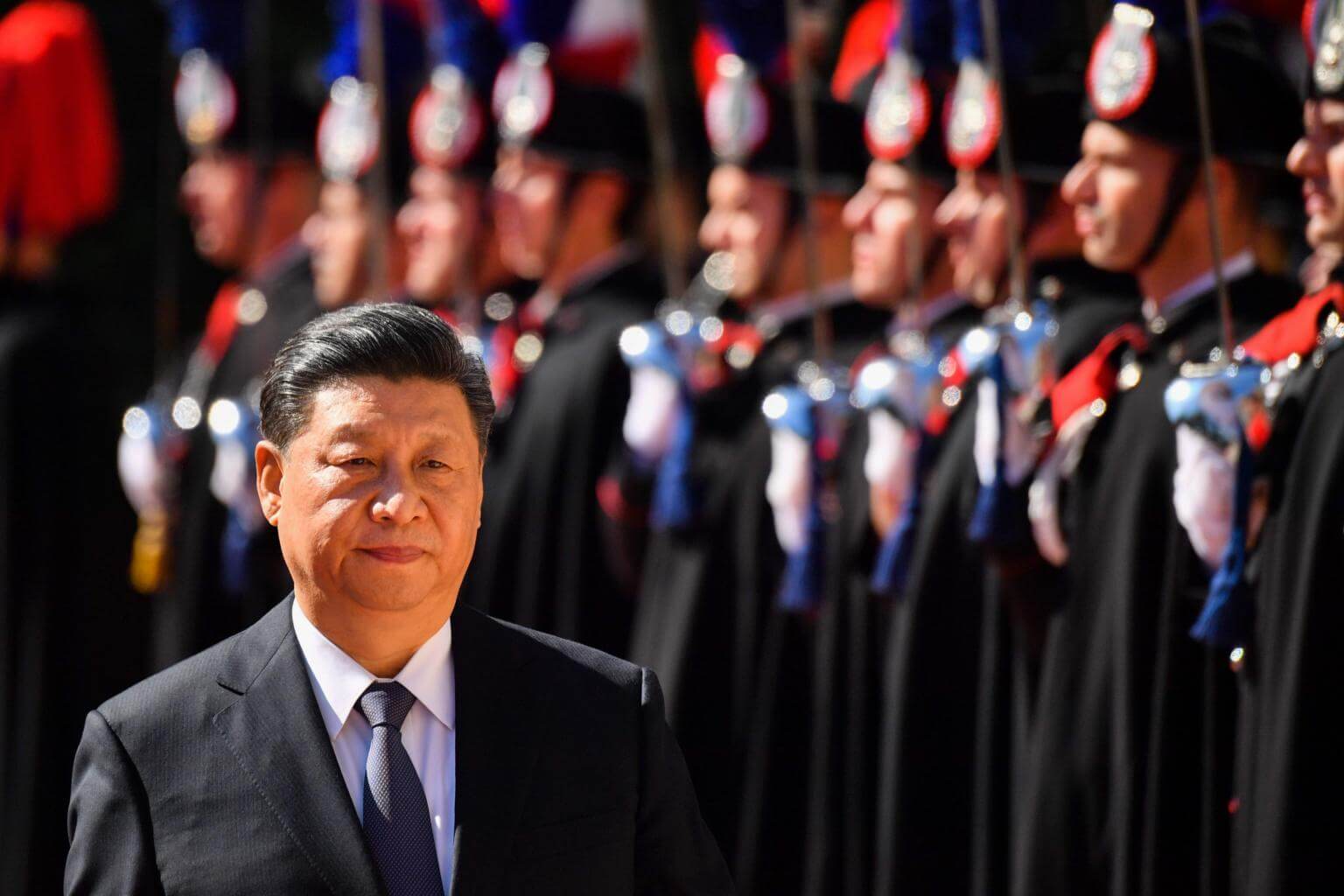 China's President Xi Jinping reviews Italian Carabinieri during a welcoming ceremony upon his arrival for a meeting with Italy’s Prime Minister at Villa Madama in Rome, on March 23, 2019.