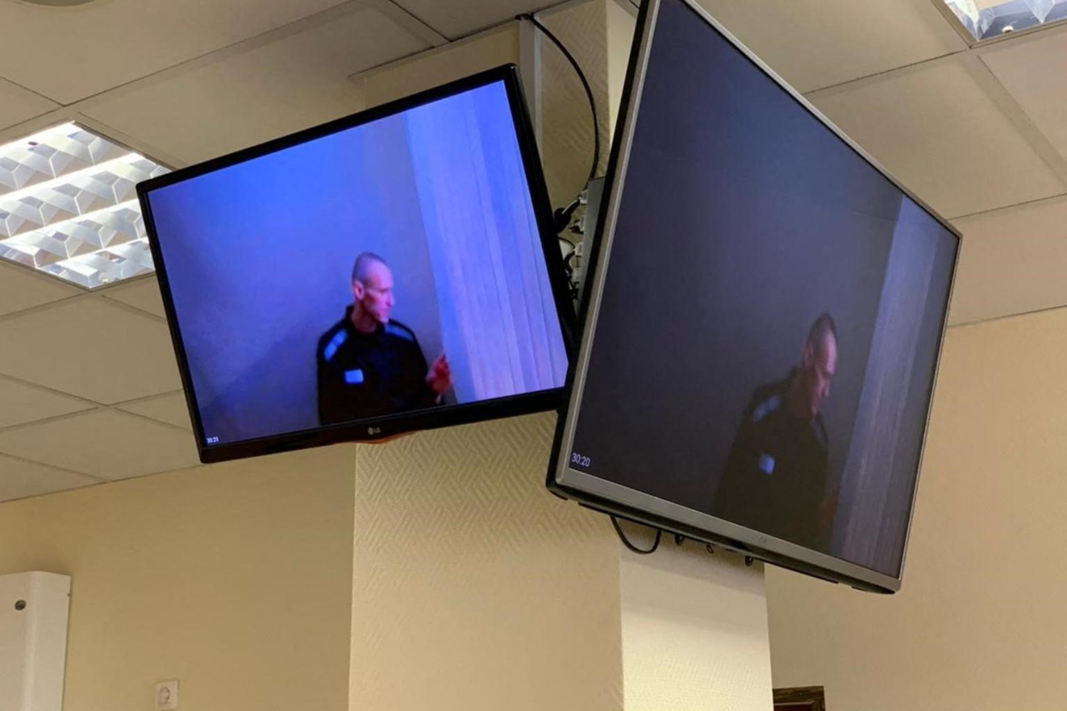 Alexei Navalny appears on screens via a video link from prison before a court hearing at Moscow's Babushkinsky district court on April 29, 2021.