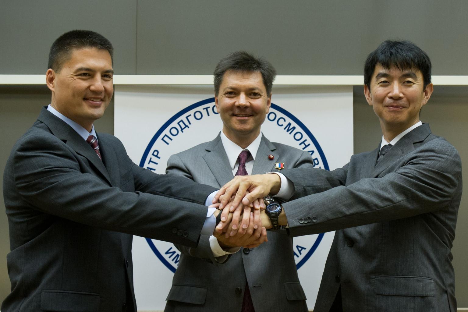 Astronauts (from left) Kjell Lindgren, Oleg Kononenko and Kimiya Yui pose during a press conference.