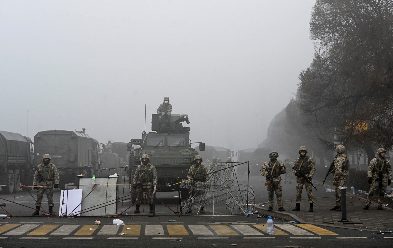 Soldiers standing guard at the main square in Almaty, Kazakhstan, on Jan 6, 2022.
