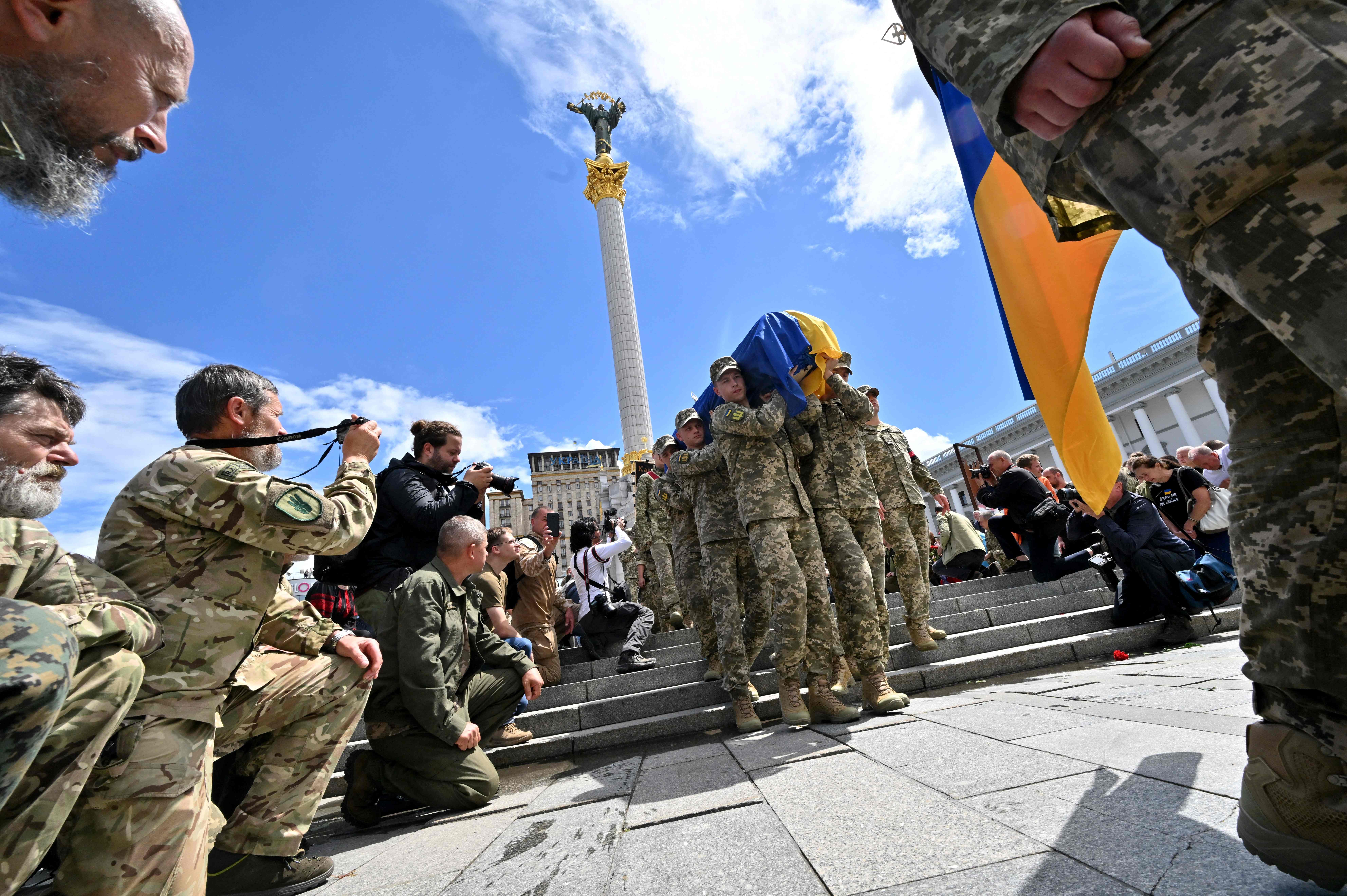 Ukrainian servicemen kneel as fellow soldiers carry the coffin of their fallen comrade, Oleh Kutsyn, during a funeral ceremony in Kyiv's "Maidan" Independence Square, on June 22, 2022.