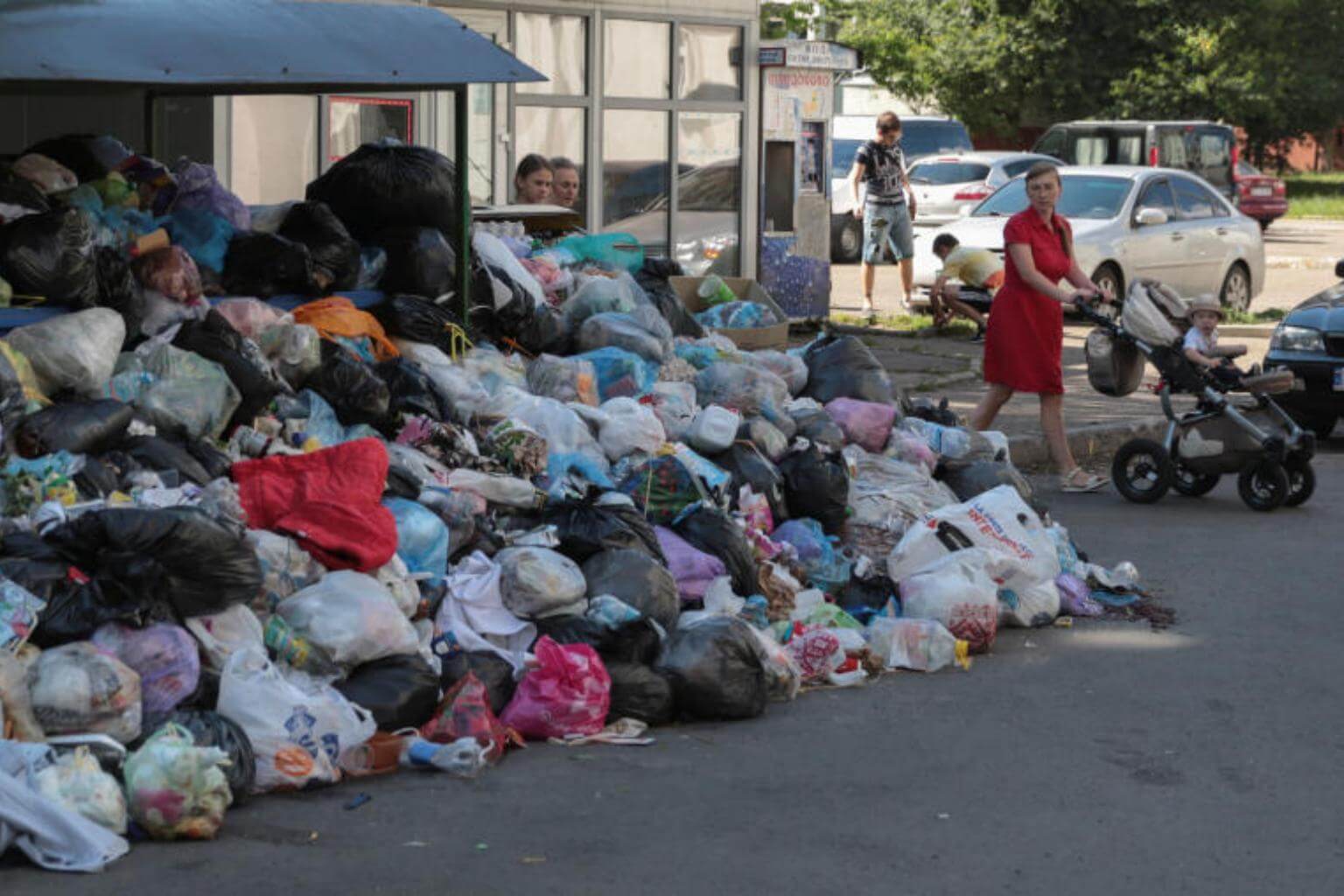 A woman pushes a child in a stroller past a pile of trash in Lviv, Ukraine, on June 19, 2017.