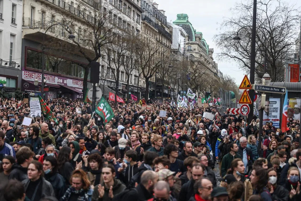 Thousands of people participate in a protest against government pension reform in Paris, France, on March 23, 2023.