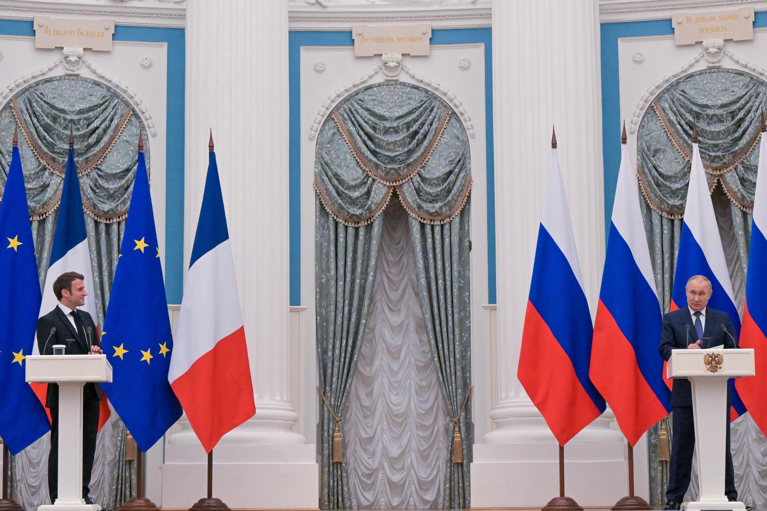 French President Emmanuel Macron (left) and Russian President Vladimir Putin at a joint press conference in Moscow on Feb 8, 2022.