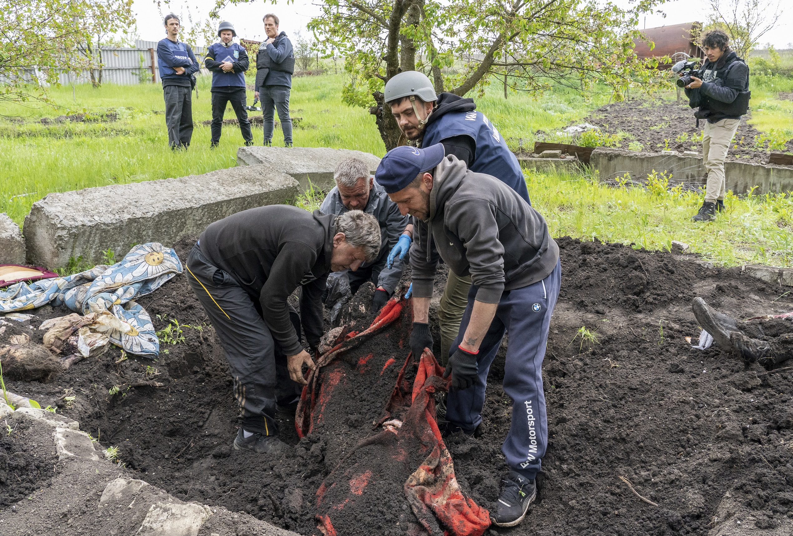 Police experts exhume the bodies of local civilians, in the courtyard of a private house in Stepanki, on May 11, 2022.