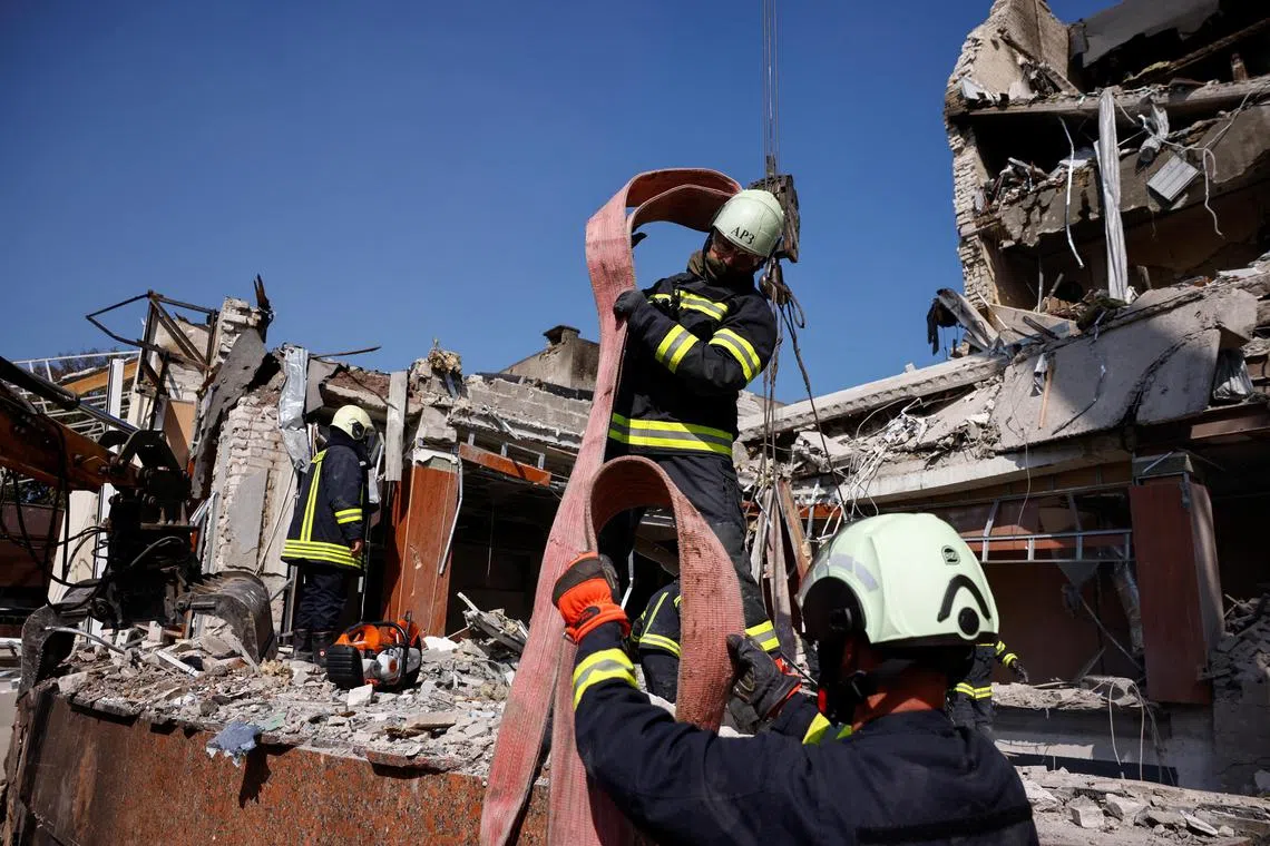 Emergency workers at the site of a hotel heavily damaged during a Russian missile strike in Cherkasy, Ukraine, on Sept 21.