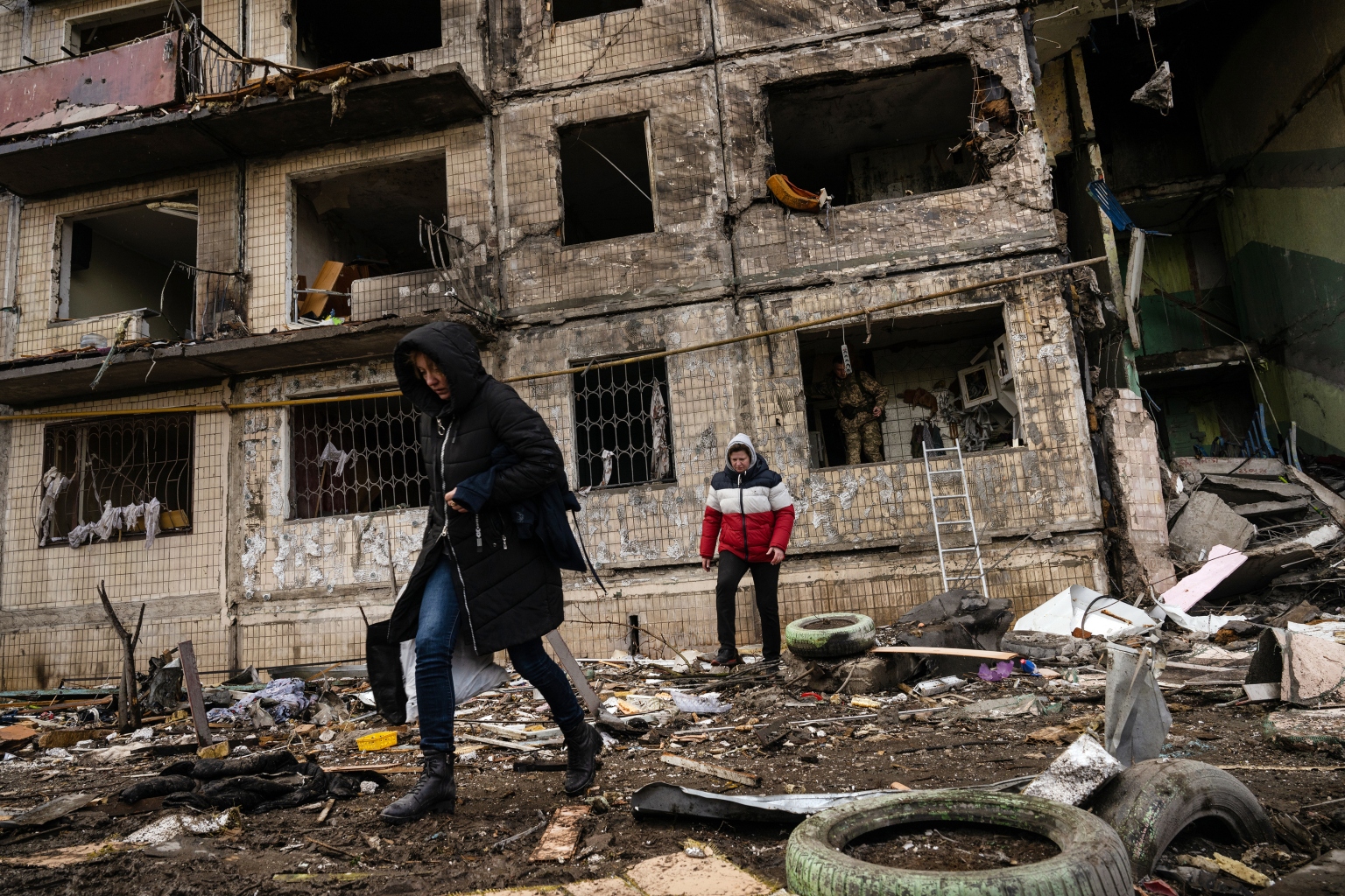 Residents salvaging some belongings after an apartment complex in Kyiv was shelled, on March 14, 2022.