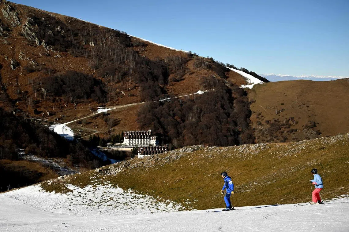 People skiing down a slope covered with artificial snow in Artesina, a small ski resort in north-western Italy, amid a lack of snowfall.