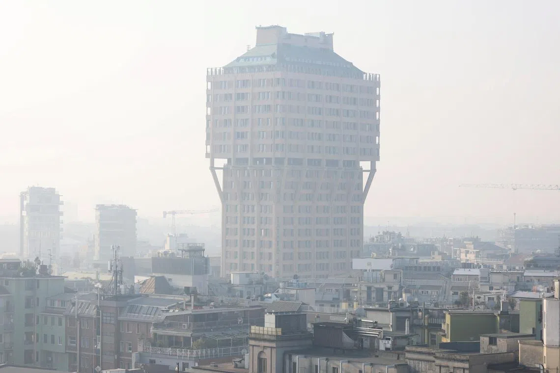 Milan’s Velasca Tower shrouded in smog on Feb 20.