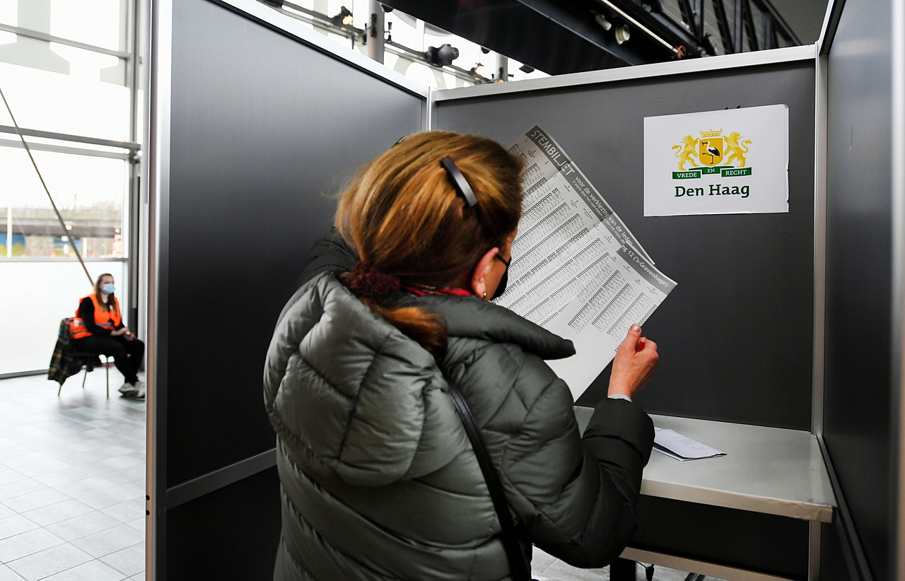 A woman attends voting during the Dutch general election, in The Hague, Netherlands on March 16, 2021.