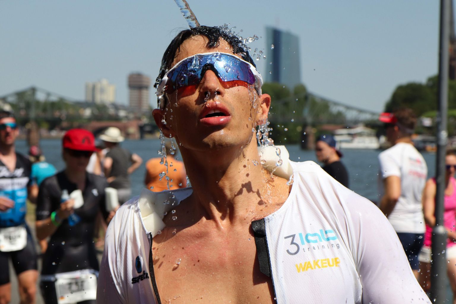 An athlete gets water poured on him as he competes in an Ironman race in Germany, June 30, 2019.