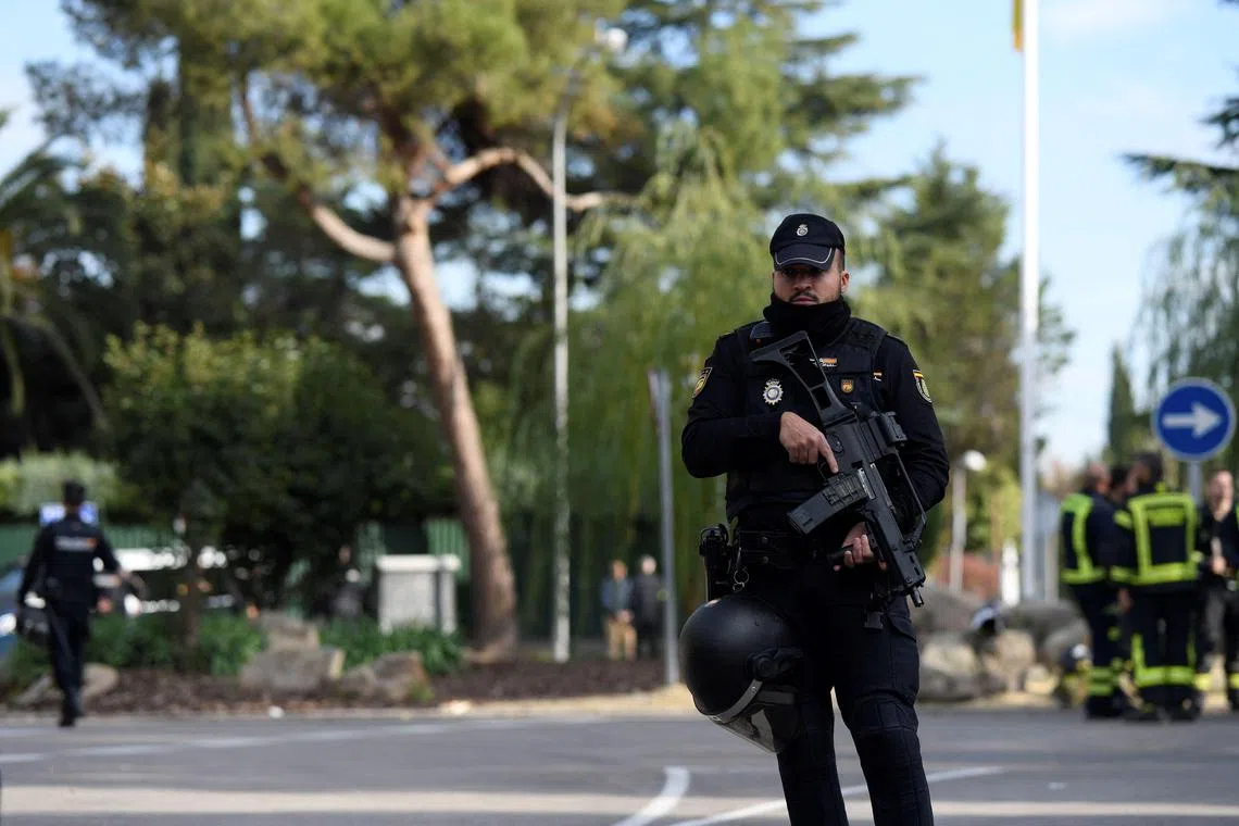 Spanish police secure the area after a letter bomb explosion at the Ukraine's embassy in Madrid.