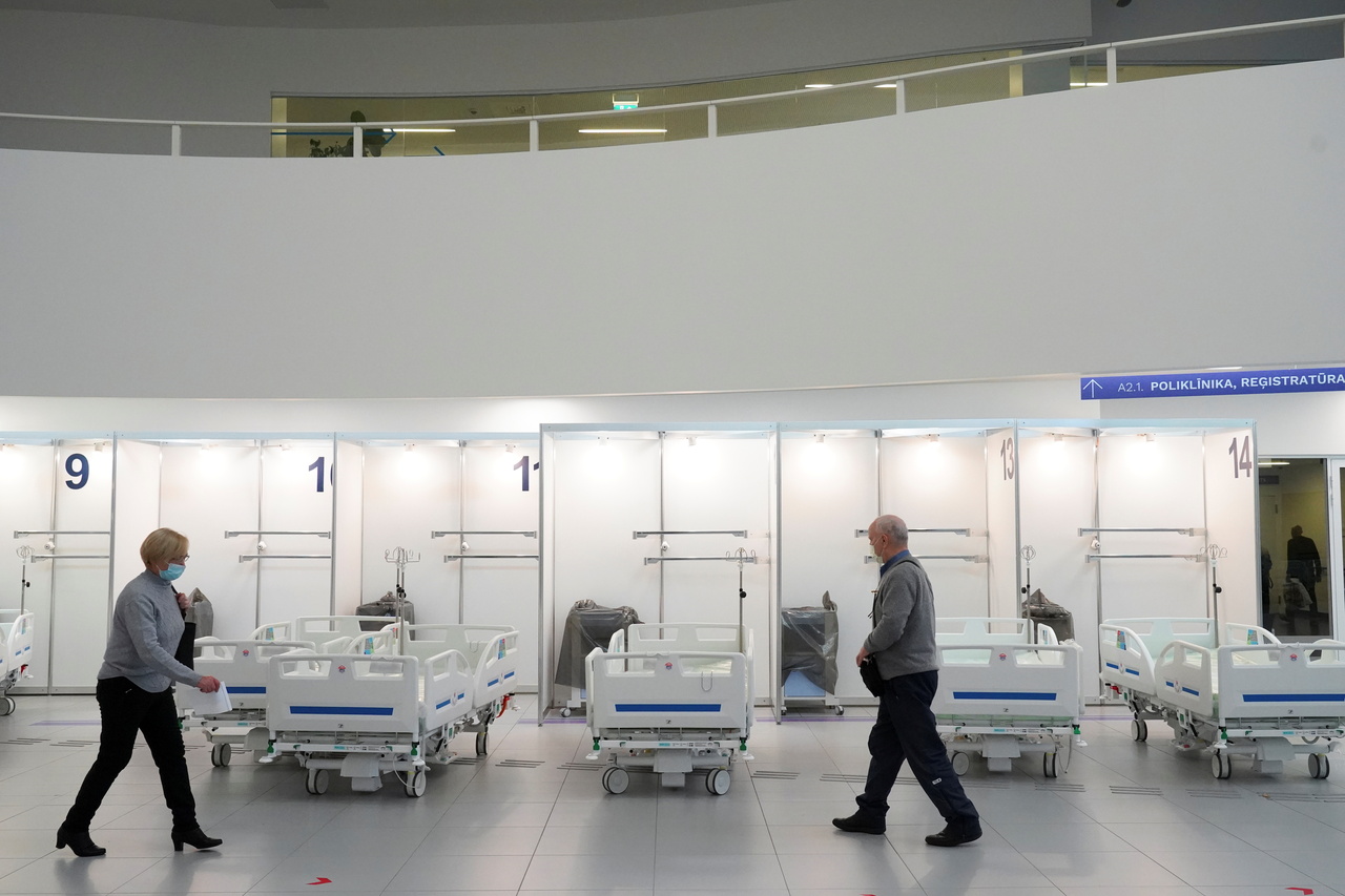 Makeshift beds for Covid-19 patients in the atrium of Pauls Stradins Clinical University Hospital in Riga, Latvia, on Oct 20, 2021.