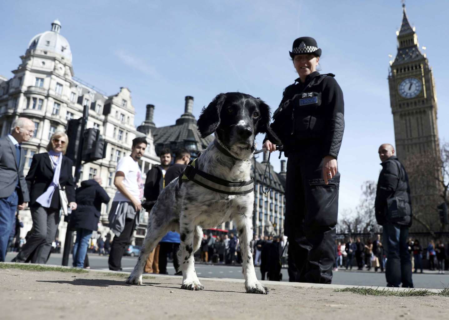 A police dog handler patrols in Parliament Square following the attack in Westminster, March 26, 2017.