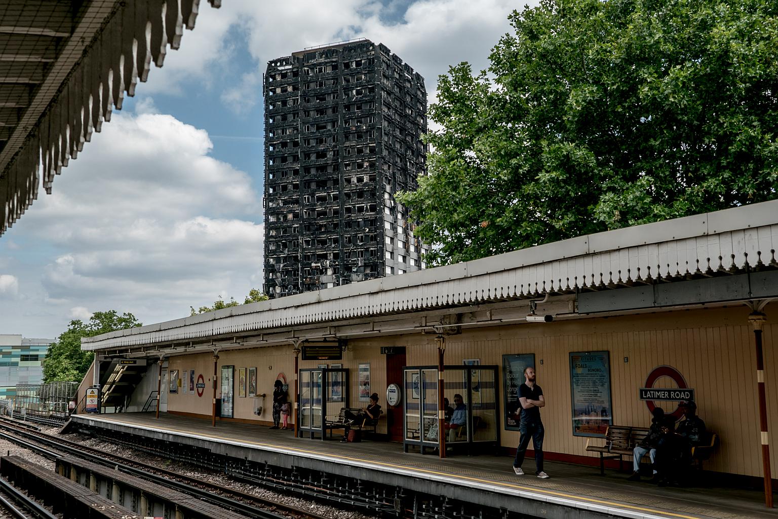 What remains of Grenfell Tower, seen from a local Underground platform, in London on July 1, 2017.