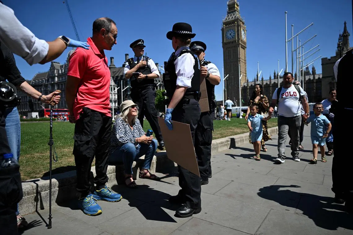 Protesters are arrested and their placards confiscated in Parliament Square, London, on July 12.