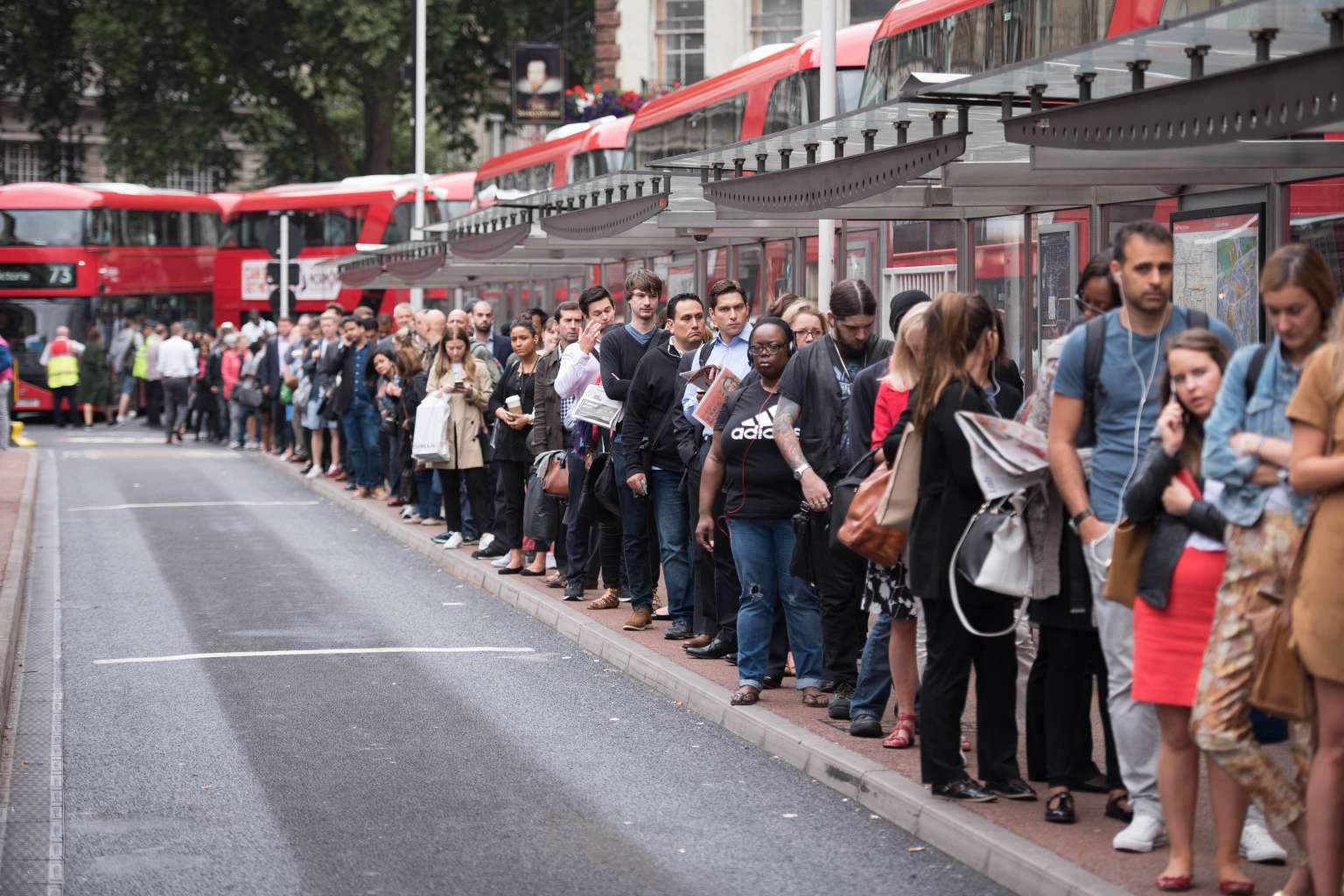 Commuters queue for buses as a 24-hour tube strike hits the morning rush hour at Victoria station, central London.