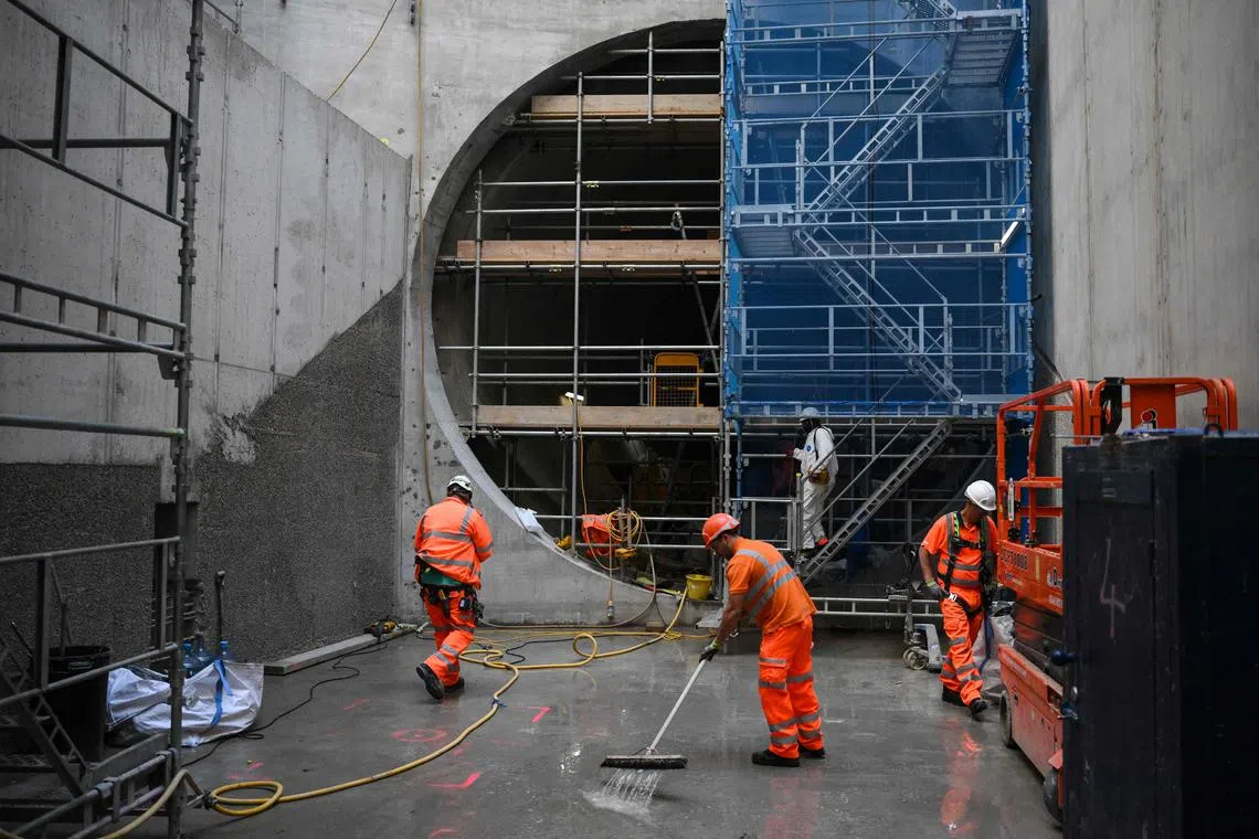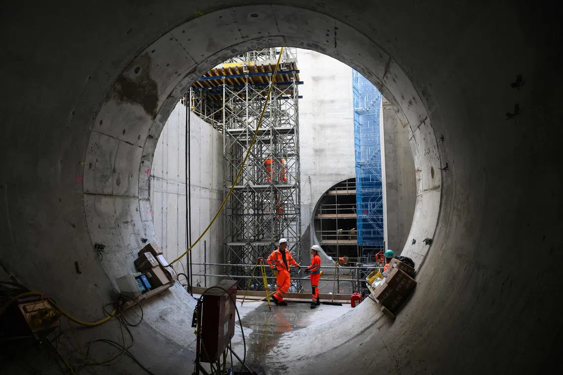 Civil engineers work next to a 7m-wide concrete tunnel at the Thames Tideway building site, in west London.