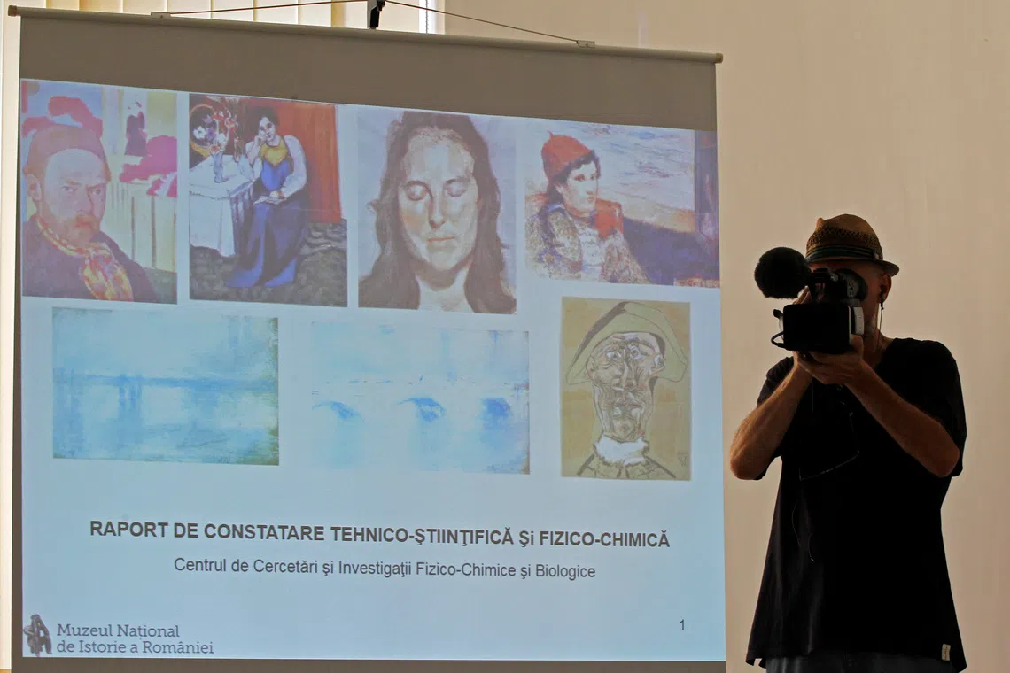 Images of stolen paintings during a news conference at Romania's National History Museum, in Bucharest, on Aug 8, 2013.