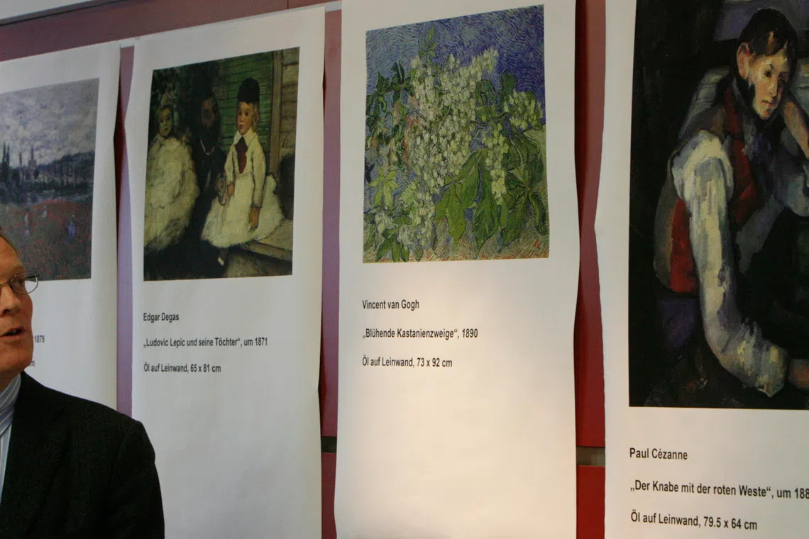 Buehrle collection director Lukas Gloor showing painting reproductions at a press conference in Zurich, on Feb 11, 2008.