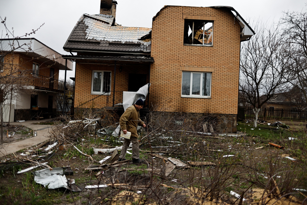 A man walks outside his house that he told Reuters was destroyed by Russian troops in Bucha, Ukraine, on April 19, 2022.