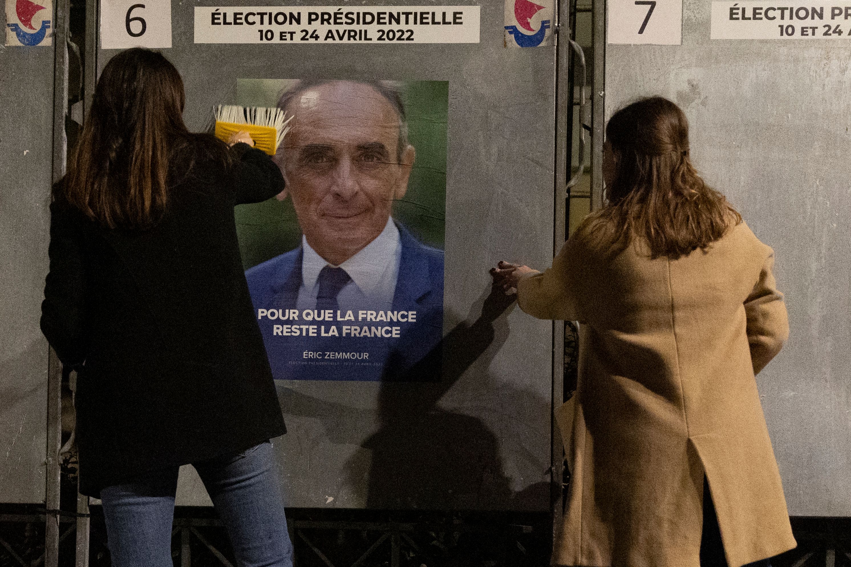 Supporters of far-right presidential candidate Eric Zemmour paste his official campaign poster on electoral billboards in Paris.