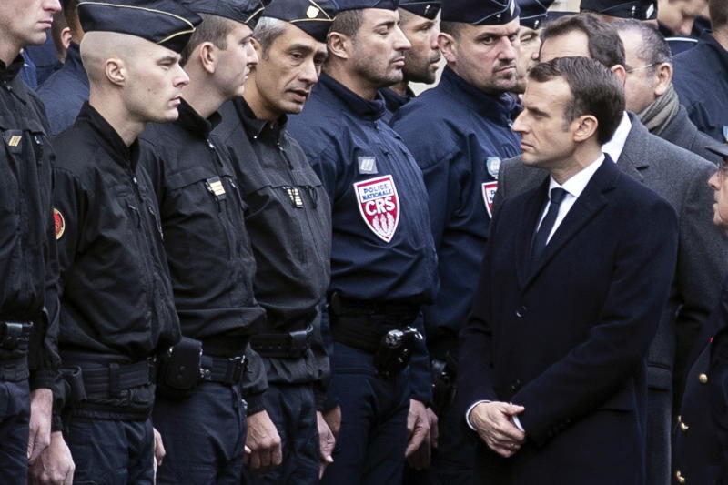 French President Emmanuel Macron (right) talks to riot police officers next to the Champs Elysee in Paris, France, on Dec 2, 2018.