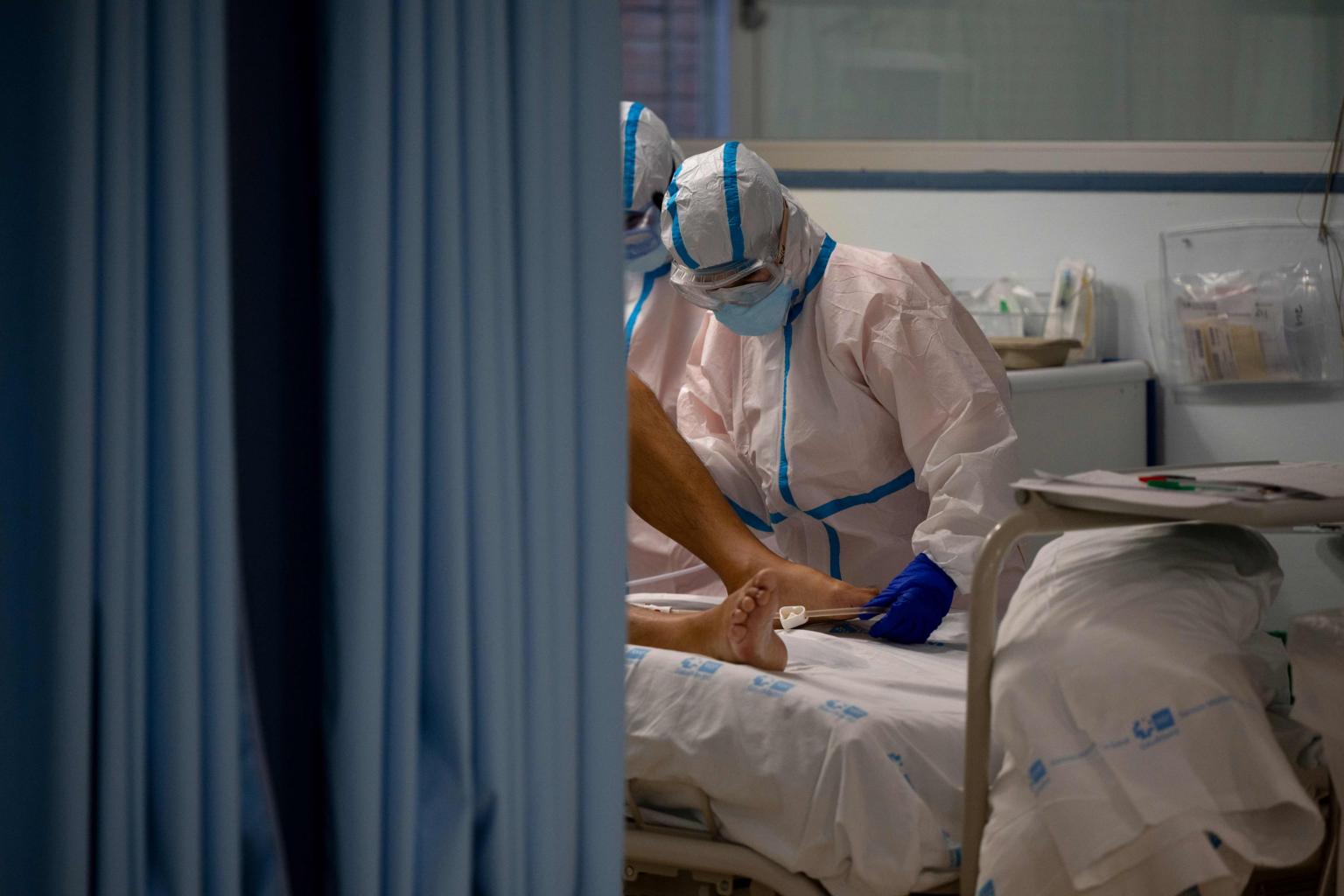 Healthcare workers attend to a Covid-19 patient at the Severo Ochoa University Hospital in Leganes, Spain, on Oct 16, 2020.