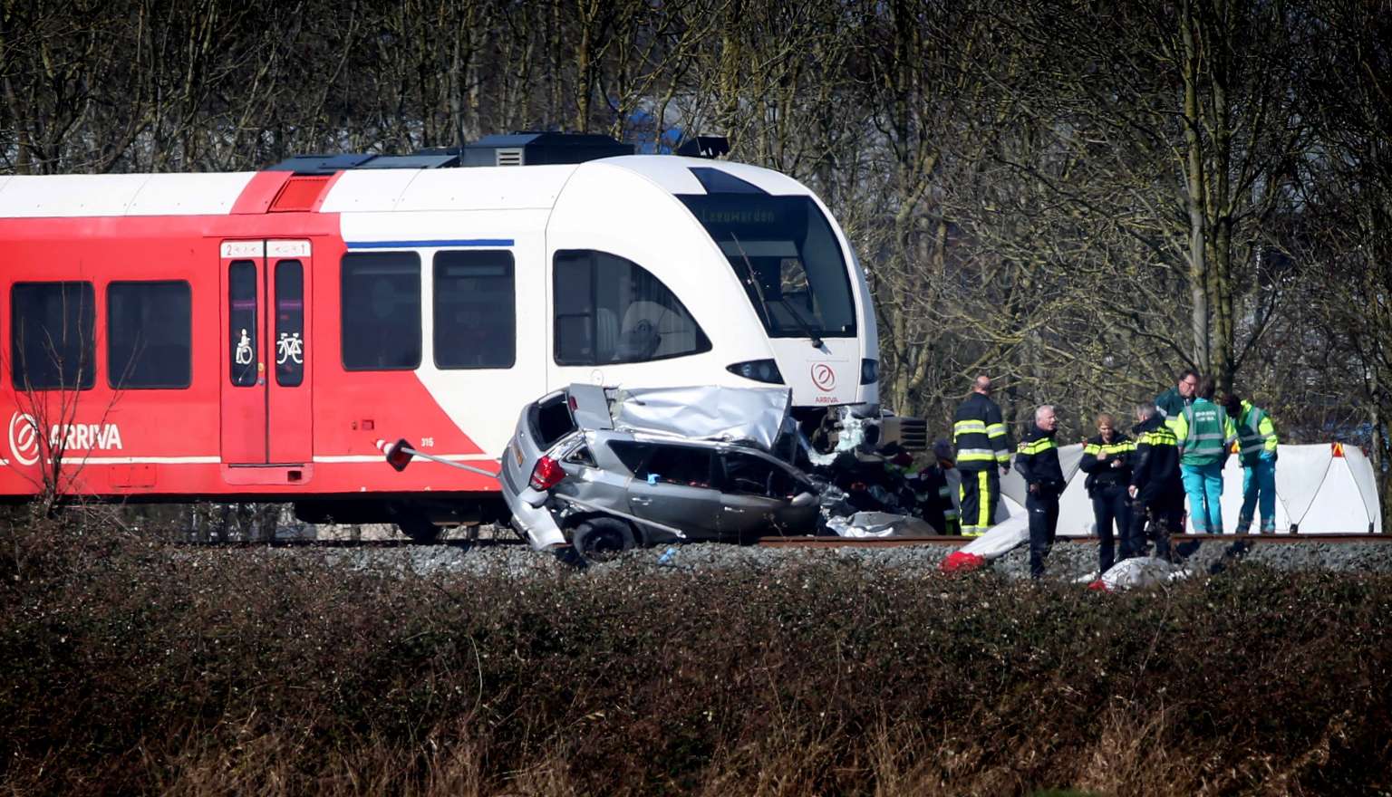 Rescue workers operate at the scene of a train crash with a car, near Harlingen, the Netherlands, March 27, 2017.